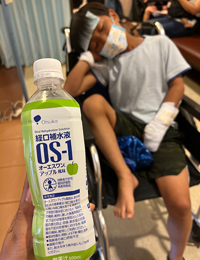明け方に病院に到着して帰ったのはお昼過ぎだったのですが、その間ずっと点滴をしていました。その際、看護師さんから点滴中10分に1回くらいのペースで常温のOS-1をキャップ一杯分飲ませるようにと指示がありました。あまりたくさん飲ませると吐いてしまうので、少しずつ、回数を増やして飲ませるといいそうです。この時初めて見たのですが、OS-1のアップル風味があるようで、子どもには普通のOS-1よりこちらの方が飲みやすいようです。途中痛み止めの点滴も入れつつ、ゆっくりゆっくり身体に水分を入れながら、6時間後にようやく点滴が終了しました。