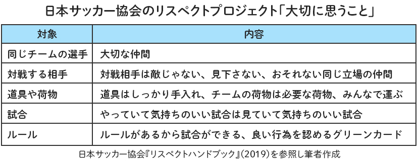 サッカー協会の資料を通して、サッカーキッズにとってのリスペクトとは、サッカーに関わるすべてのヒト(チーム内外の選手、コーチ、レフェリー、家族など)やモノ(ボールやシューズ、チームの荷物など)そして、サッカーというスポーツに感謝にすることだということがわかります。