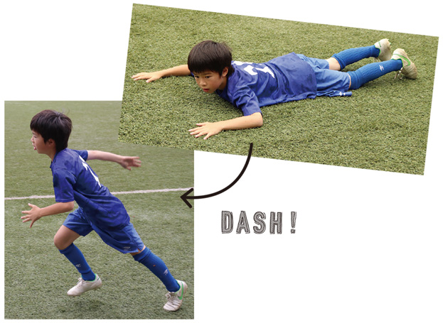 ウォーミングアップにオススメなのが、うつ伏せに寝た状態からのダッシュ。起き上がる時にグッと腕に力が入るので腕が鍛えられ、肩の使い方も身についていきます。