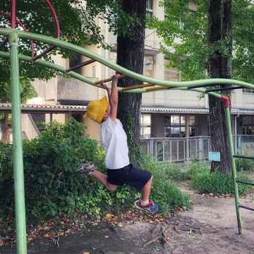 普段の遊びの中で取り入れてほしいのが、公園や校庭にある遊具。中でもうんていやのぼり棒は、身体を支える腕の力や腹筋、背筋などが鍛えられます。またジャングルジムは両手、両脚を使って上り下りするので、身体の操作性、バランス力や空間認識能力の向上にも。