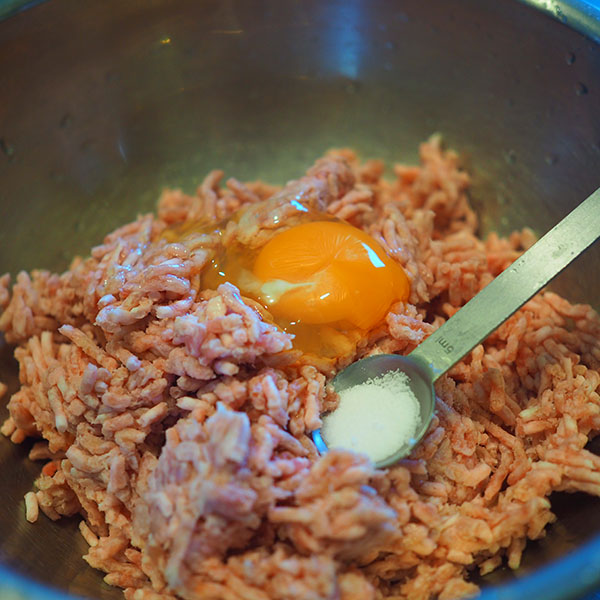 - 豚肉に卵、塩を加えよく混ぜる。