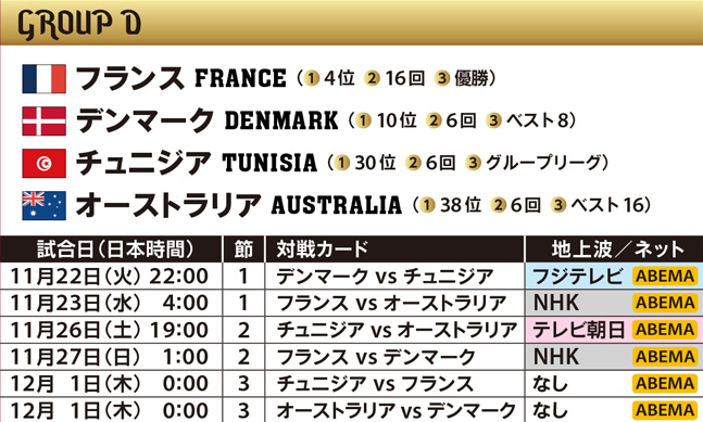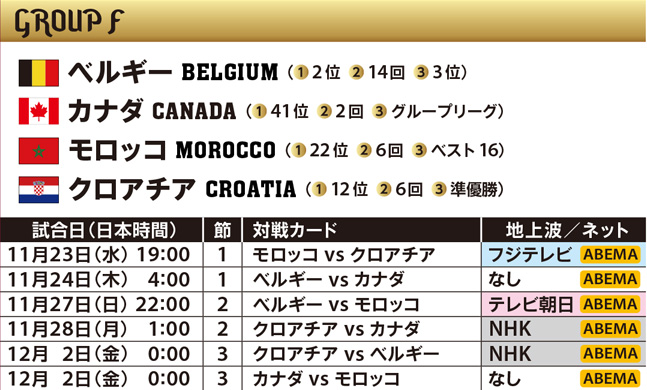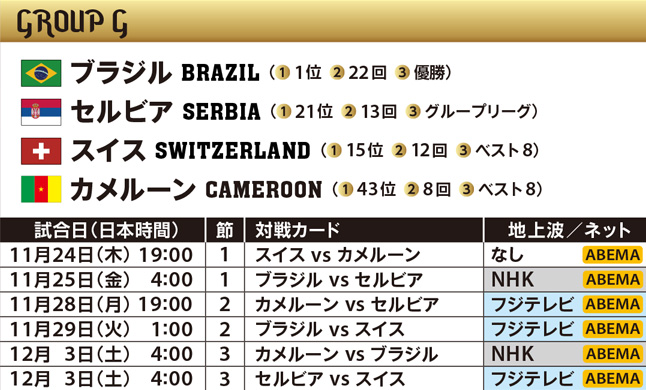 大会常連の列強トップに位置し、5度の優勝を誇るブラジルは大黒柱のネイマールを中心に大会随一の選手層で優勝候補最右翼。若手の充実で他国も羨む戦力を誇り、今季バロンドールのベンゼマを擁するディフェンディングチャンピオン・フランス、優勝候補2チームが同組となったスペイン、ドイツ、黄金世代が円熟期を迎えた世界ランク2位のベルギー、衰え知らずの世界最強ストライカーのレヴァンドフスキ擁するポーランドは、大会にその名を刻むことになるのか。見どころは尽きない。