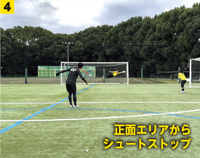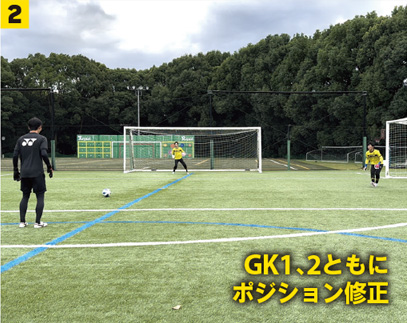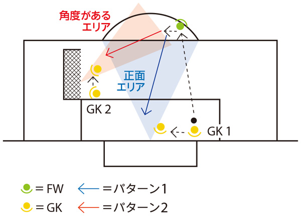 またそれぞれのゴールを守る際に、キッカーからの角度が異なる。少し距離はあるが正面でコースが広い状況と、距離は近いがシュートコースが限定されている状況の中で、FWのボールの持ち方も予測に入れ適切に素早くポジショニングと構えを決めていくことが重要である。FW役も選手が行う事でボールの置き所やキックのトレーニングにもなる。それぞれの役割、狙いを理解しトライしてみよう。
