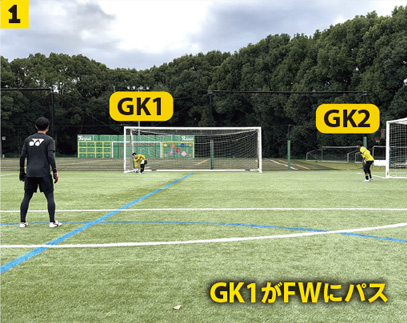 1GK1がポスト横からボールをFWにスローイン。GK2はGK1にポジションを合わせる。
