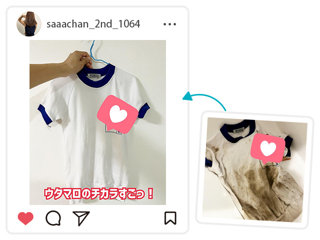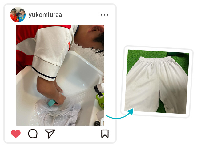 「我が家のユニフォームの泥汚れにはウタマロリキッド。汚れ部分にリキッドを少量、短時間つけ置きして擦ったらあっという間に購入時と同じキレイさに。簡単なので2年生の次男でもピカピカにできました」