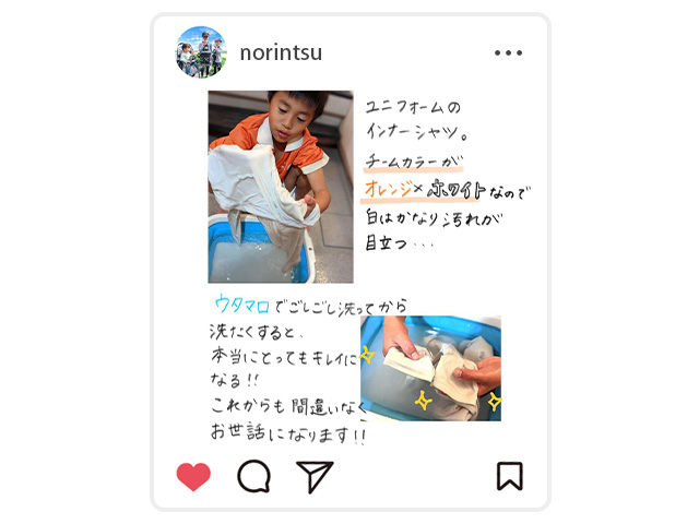 「ウタマロは以前からのヘビーユーザー。石けんに限らずクリーナーなども毎日お世話に。とくにユニフォームの泥汚れは、そのまま洗濯機に入れるよりもウタマロで洗ってから洗濯機に入れた方が確実にキレイになります」