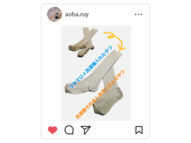 「うちに常備しているウタマロ石けん。正直家事はあんまり得意じゃないけど、私はウタマロさえあれば大体のことは解決できる!ウタマロ石けんでサクッと洗って洗濯機に入れるだけで、白いウェアや靴下がまっ白に」