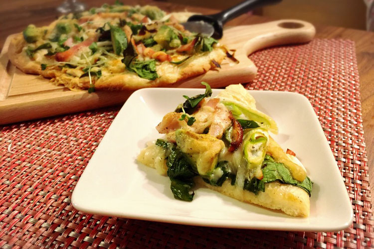 - 長ネギ、ほうれん草、ハムなどを乗せ、塩コショウをし、とろけるチーズを乗せる。醤油とオリーブオイルを2周程軽く回しかける。