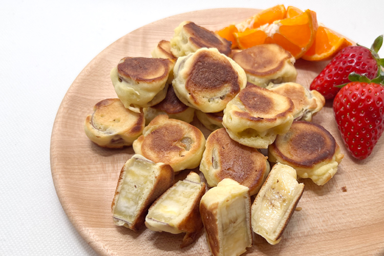 補食の定番、バナナや芋を包んだパンケーキ。一口ずつ食べられるので量の調節もしやすいのがうれしい一品です。