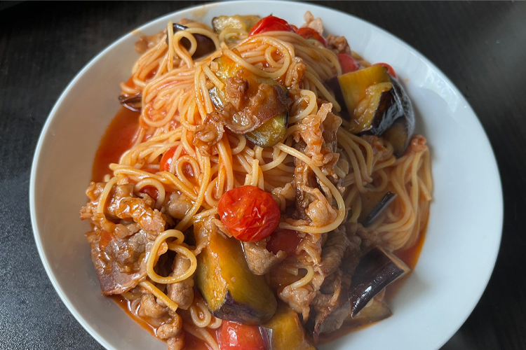 メニューその③「牛肉とナス・ミニトマトのパスタ」