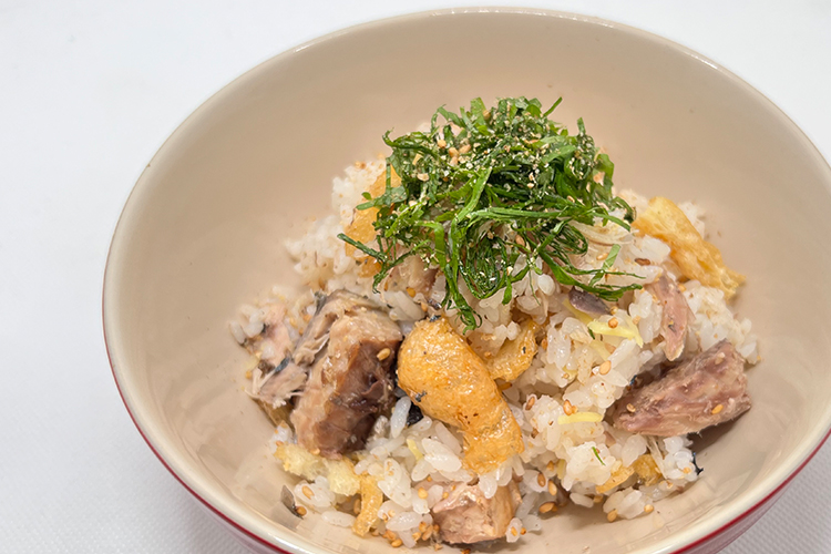 - ④ ①の酢飯に③のサバ、②の油揚げの順に混ぜ込み、器に盛り付け、大葉・すりごまをあしらう。
