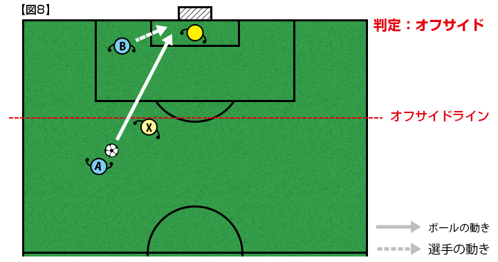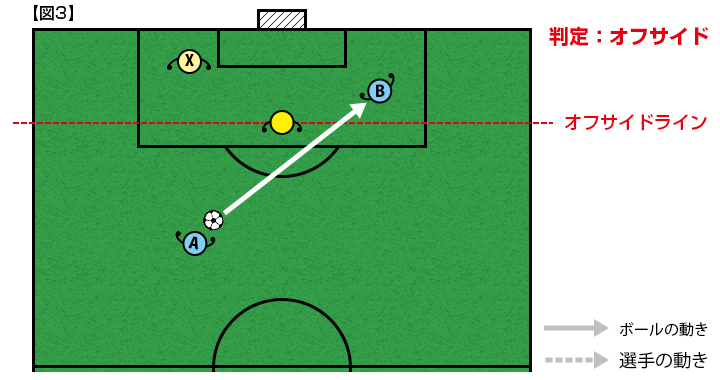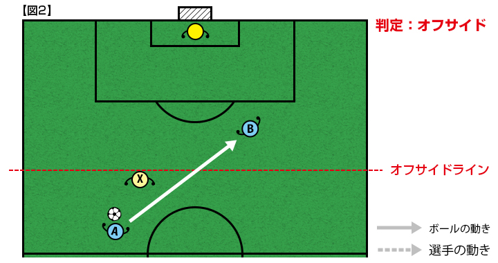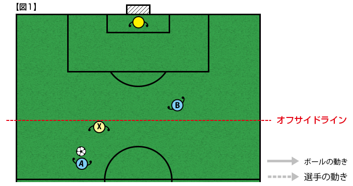 【図1】をご覧ください。守備側の後ろから2人目の選手Xの位置にゴールラインに平行にかかれた赤い線をオフサイドラインと言います。このラインは架空のもので、守備側選手の位置、あるいはボールの位置によって変わります。攻撃側選手にとってオフサイドラインよりもゴールに近い位置が「オフサイドポジション」となり、選手Bはオフサイドポジションにいます。オフサイドポジションにいるだけでは反則になりません。