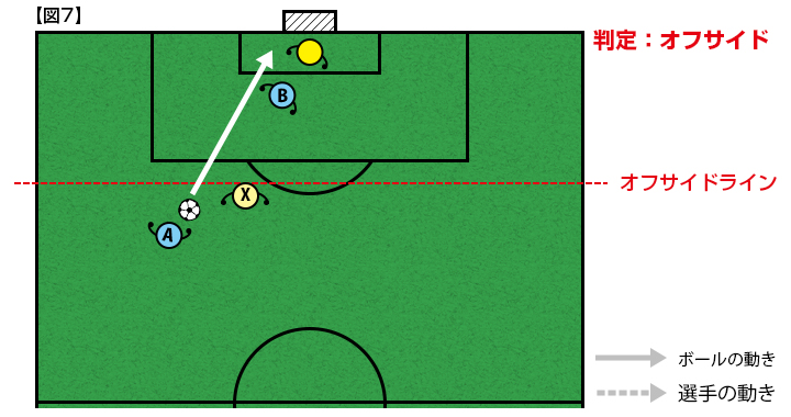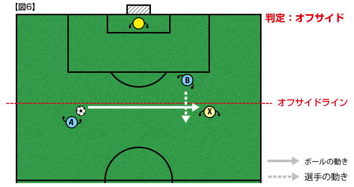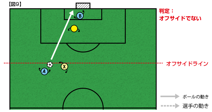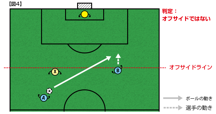 【図4】同じ状況で、選手Bは守備側の後方から2人目の選手Xのオフサイドラインより前にいない・並んでいる、「オフサイドポジションにいない」ので、プレーにかかわってもオフサイドの反則となりません。