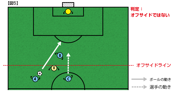 【図5】A,B,Cが攻撃側、Xが守備側の選手で、Bはオフサイドポジションにいます。Bはプレーにかかわるとオフサイドの反則となります。Bは立っているだけでは反則にはなりませんが、相手に「インパクト」を与えていると判断されれば反則となります。例えば、XがBとぶつかった、あるいは、ぶつかりそうになってスピードを緩めたならば、インパクトを与えたと判断されます。