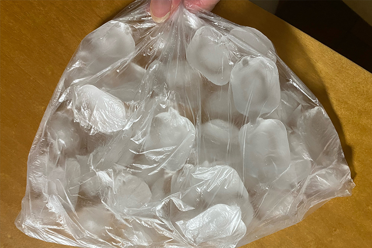 氷を氷嚢に入れての処置もありますが、衛生面などからビニール袋を使用する事もあります。ビニール袋に氷を入れて空気を抜きます(吸って空気を抜きます)。この際、空気を抜く前になるべく氷が平になるようにしておくと、部位に合わせやすいです。またこの氷を袋に入れる前に水で流す事で角が取れますよ。