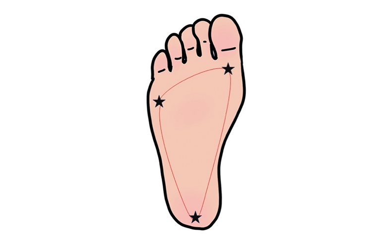 本来⾜は、⺟趾球と⼩趾球を繋ぐ横アーチと、それぞれが踵⾻(かかとの⾻)に繋がる縦アーチを⽀点とした3点でバランスを保っています。また、⾜指がきちんとついた3点歩⾏で重⼼が正しい位置なのですが、その⾜の指が地⾯についていない状態が浮き指と⾔われています。