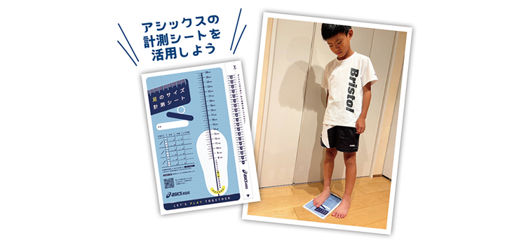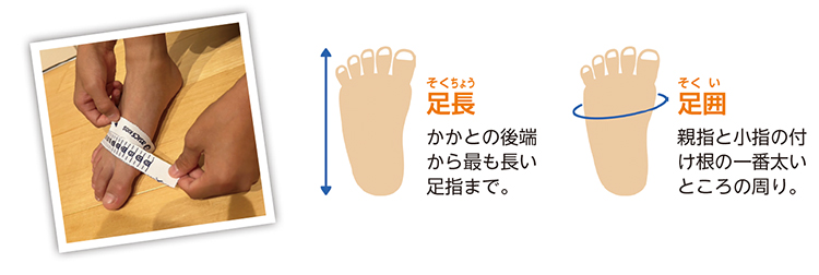 足にあった靴を選ぶためには、足の測り方も大事。足の詳しいサイズを測るには、かかとから最も長い足指までの長さ「足長」と、親指と小指の付け根の一番太いところの周り「足囲」を計測すること。体重のかかり方で足の大きさは変わってくるので、立った状態で両足に均等に体重をかけて測るのがポイントです。子ども一人ではむずかしいので、親御さんが測ってあげましょう。