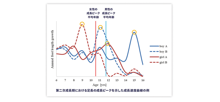 下記のグラフを見ると、第二次成長期における子どもの足の成長は個人差が大きく、男子に比べ女子の方が早く成長するなどの傾向がわかります。また、成長のピークを過ぎると、ほぼ大人の足と変わらないサイズになることもわかっています。そのため、とくに第二次成長期は、個々の成長にあわせたシューズ選び、さらに成長のピークを迎えた後、大人の足になった時には、親御さんが大人用のシューズをきちんと提案してあげることが重要です。