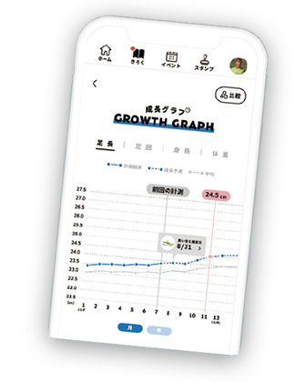 アシックススポーツ工学研究所に蓄積された日本人の子どもの足形計測データをもとに、16歳まで足のサイズを成長予測。成長の記録をさまざまなグラフで確認でき、平均の足のサイズを知ることも。