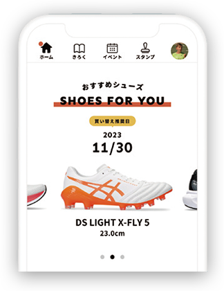 子どもの足が大きくなってくると「いつ大人用サイズに切り替えればいいの?」と迷うことも。例えば子ども用のスパイクの場合、大人用に比べて柔らかく曲げやすい設計になっているため、大人の足になっているのに子ども用のスパイクを履いていると、パフォーマンスが落ちてしまうこともあるのです。「ASICS STEPNOTE」を活用すれば、足の成長に応じて大人用のシューズに移行するタイミングも知らせてくれるので、迷うことなくスムーズに切り替えることが可能です。