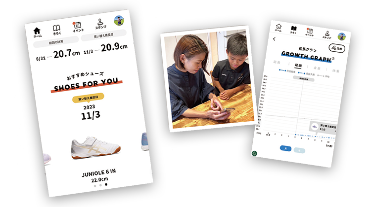 正しい方法で定期的に足の計測をすれば、成長にあった適切なシューズサイズを知ることができます。「ASICS STEPNOTE」を使えば、忘れがちな計測のタイミングや買い替え推奨日をリマインド機能で知らせてくれるので、子どもの足にあった適切なサイズのシューズを選んであげることができるのです。