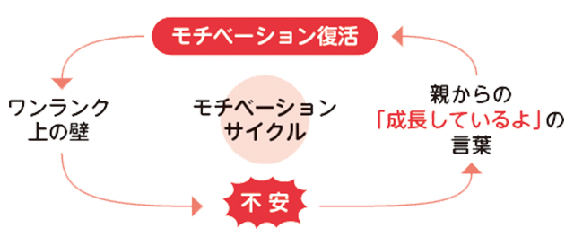 個人差があるものの、モチベーションには浮き沈みのサイクルがあります。沈んでいる時、子どもは不安になっているので、微々たることでも「成長している」といった声をかけてあげることが大事。その際、「ドリブルが前より速くなっている」など、子ども自身の成長にフォーカスするような言葉をかけてあげると不安が解消され、モチベーションの復活に。