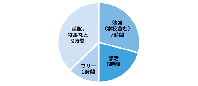 「753の法則」とは、1日24時間のうち、睡眠や食事、入浴など生理的に必要な9時間を引いた残りの15時間を、勉強に7時間、スポーツ(部活)に5時間、フリーに3時間を分配するというもの。勉強時間には学校の授業も含み、スポーツの時間には移動や身体のメンテナンスなども含みます。小・中学生の場合は、生理的な時間が12時間程必要になるので、勉強6時間、スポーツに3時間、フリーに3時間という分配に。文武両道には、時間をいかに上手く使うかがポイントです。