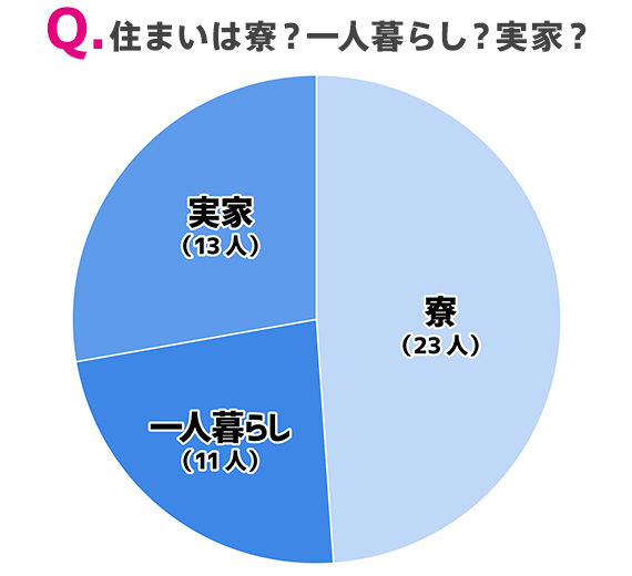 住まいに関しては、約半数が寮生活、実家と一人暮らしは同程度の数に。一人暮らしと寮を合わせると、34人と3分の2が親元を離れて生活しているということになりますね。