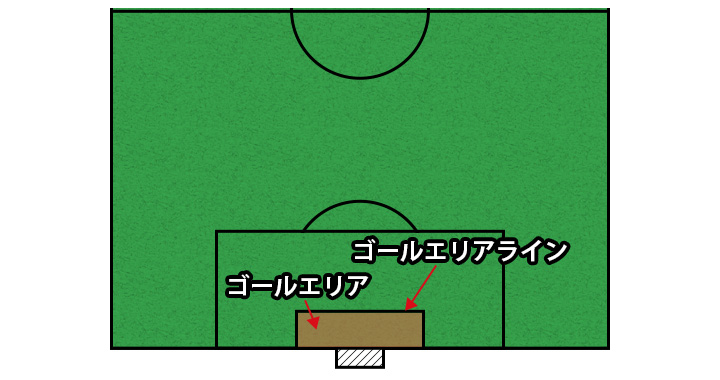 左右のゴールポストの内側より5.5mの距離に、ゴールラインに対して直角となる5.5mのラインを2本引きます。そして、2本のラインの先端を結んでできる長方形のエリアが「ゴールエリア」となります。