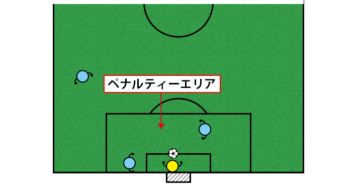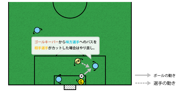 ボールがインプレーになるまでは相手の選手はペナルティーエリア外にいなければなりません。インプレーになる前に中にいた場合はゴールキックのやり直しとなります。
