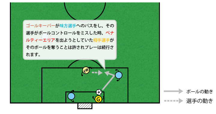ゴールエリア内を含めたピッチ内のどこでもボールを受けることができます。この結果、ゴールキーパーやフィールドプレーヤーが大きくキックすることが少なくなり、非常にスピーディになり、チーム戦術も変わりました。特に、ゴールキーパーを含めた守備側の選手の個人技術や戦術が求められるようになってきたように思います。