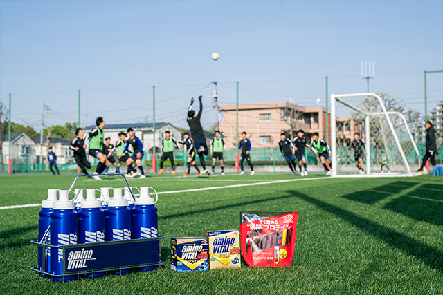 試合の前日と試合前にアミノバイタル® プロ、ハーフタイムにゼリータイプを飲み、試合後にアミノバイタル®GOLDを飲んでいます。4 年間で自分に合うか試して、良いことを継続してやっています。