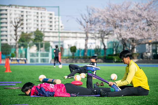 チームドクター、急性期のドクター、トレーナーら、メディカルスタッフが瞬時に情報を共有できるシステムが構築され、新設された寮には最新のトレーニングルームが備わり、管理栄養士による食事のサポートも充実。サッカー選手に多いジョーンズ骨折の年一度の検診や、ドーピング講習、栄養講習、セルフストレッチの勉強会など、万全のサポート体制が敷かれている。