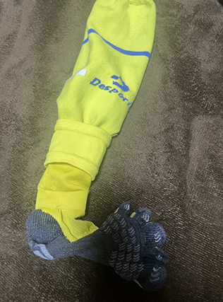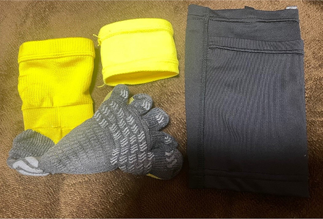 上の画像で着用しているのはチームのユニフォームとソックスです。が、呂維君は5本指ソックスのすべり止めがついているものがいいらしく、くるぶしより下を切り、上と下をつなぎ合わせて履いているようです。チームメイトもそれを真似して、何人かの子が試合でこういうソックスの使い方をしているようです。