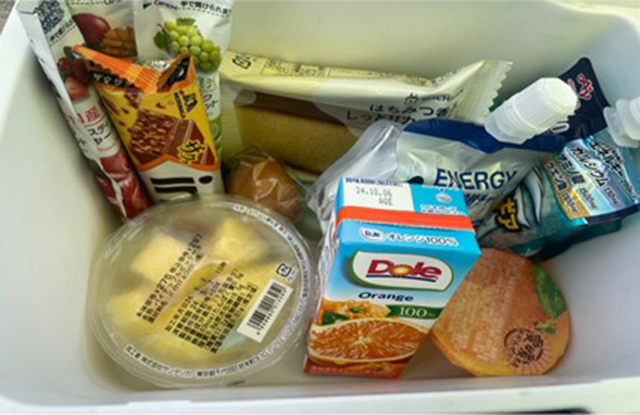 試合中の補食はゼリー、羊羹、おにぎり、チーズ、カステラ、焼き芋、干し芋などを食べているそうです。