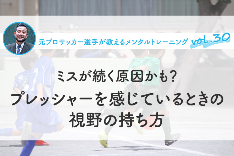 お子さんのプレッシャーが高まり、いつものプレーが発揮できなくなっているときは、視点の部分からサポートしてみると解決の糸口が見つかるかもしれません。プレッシャーがかからない方法を探すのではなく、プレッシャーかかったときの行動を見返してみましょう。