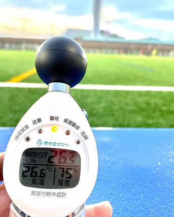 規模の大きなサッカー大会や試合会場となれば「WBGT計」を用いて、熱中症対策を時間ごとに講じている人がいます(いると信じています!)が、試合規模に関わらず、普段のトレーニング中も気にかけたい指標ですので、このWBGT計はチームに一つは備えておきたいアイテムです。