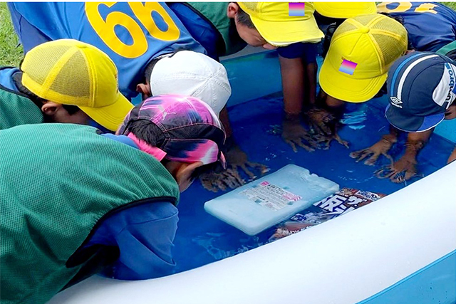下の写真は、とある会場で行われたアイスバスに手を入れる子どもたちの様子です。現場のスポーツ看護師が、しっかり温度管理をしたアイスバスを用意しています。みんな効果を実感できたのでは!? 楽しく熱中症対策ができるのが一番ですね!