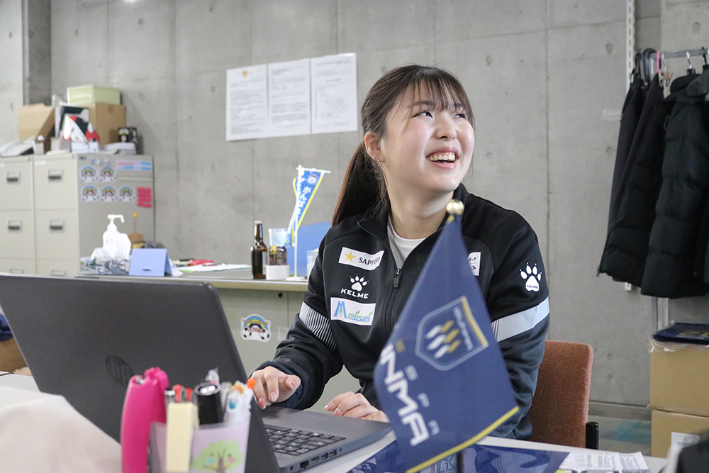 「小学生の頃にJリーグの試合を見に行ったことがきっかけでサッカーを見るようになりました。その後湘南ベルマーレの巡回授業を受けてベルマーレを応援するようになり、中学生の頃に職業講話でベルマーレのスタッフの方のお話を聞いてJリーグのフロントスタッフという仕事に興味を持ちました。高校ではサッカー部のマネージャーを務めていたので、人のために何かをすることやチームの勝利に貢献することが好きになり、今でも仕事のモチベーションになっています」