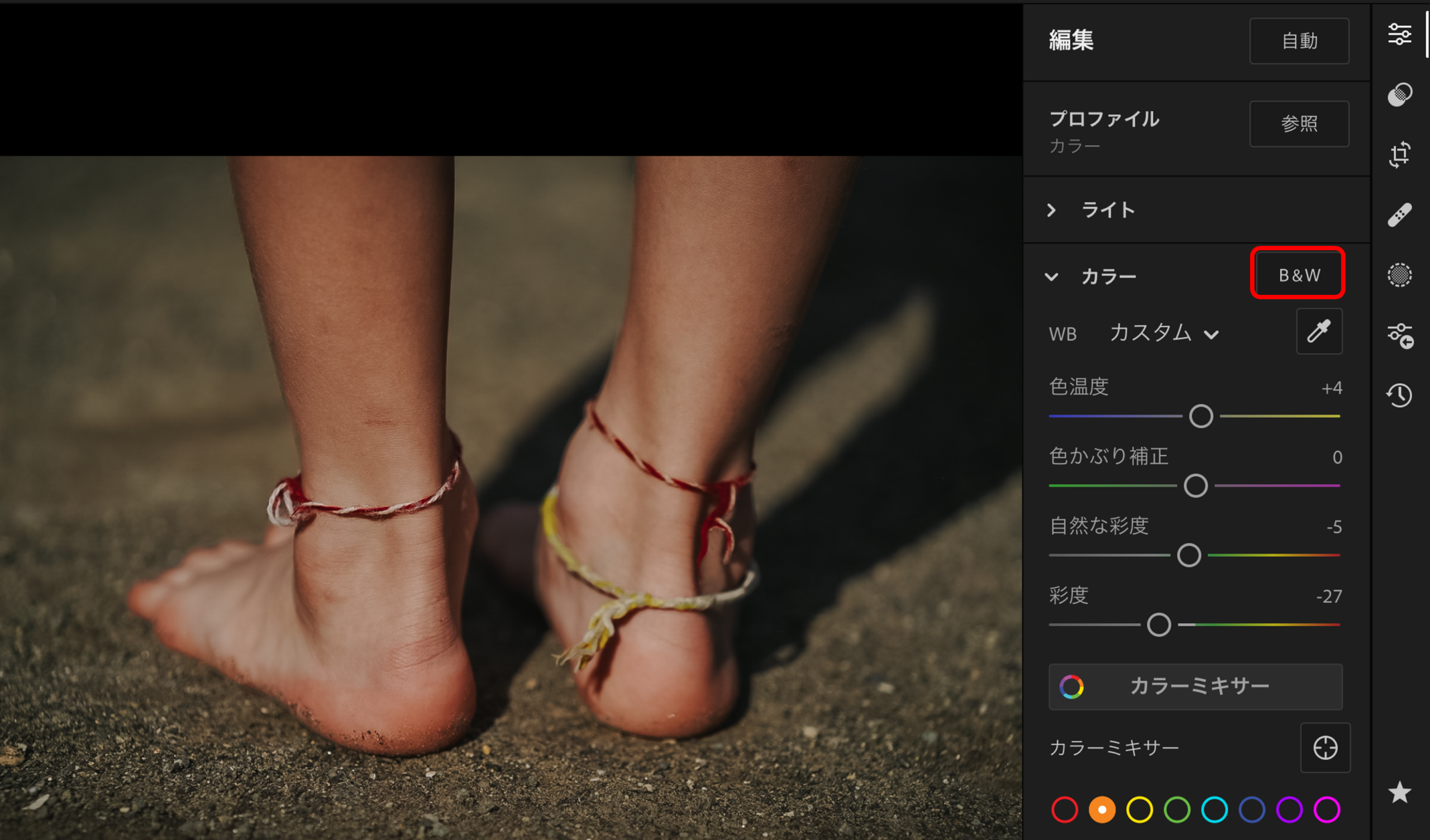 最後の方法は、少しこだわったモノクロ写真にしたい人向けです。以前のコラムでもご紹介したLightroomの編集アプリを使います。編集したい写真を選び、カラータブの「B&W」をクリックすると一瞬で素敵な雰囲気のモノクロ写真になります。その後は微調整をしていくのですが、個人的におすすめしたいのが ①コントラスト ②ハイライト ③シャドウをいじって明暗差を出し、その後 ④テクスチャ ⑤明瞭度 ⑥粒子を調整し、モノクロ写真ならではの粗さをあえて出し、雰囲気ある一枚に仕上げることです。