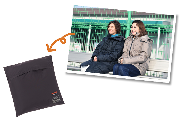 「座った時も動きやすい」と横谷さん。ジャケットタイプには収納袋が付き、畳んで収納すればミニクッションに。