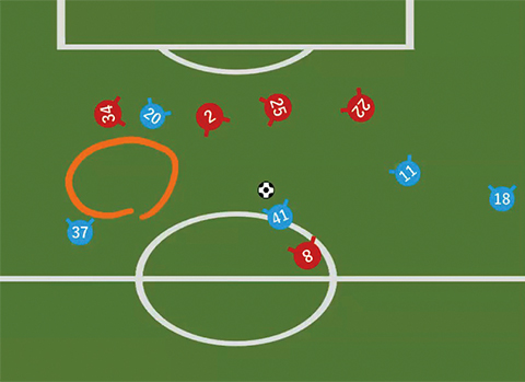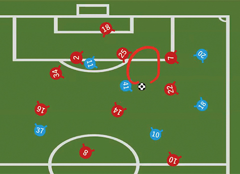 「試合中にこのスペース(丸囲み部分)がよく空くことがあり、ここでボールをもらえたらチャンスになるんですね。僕(41番)がこのあたりで待っていたら、14番(中村選手)からすごくいい縦パスがきたので、前を向いたんです」