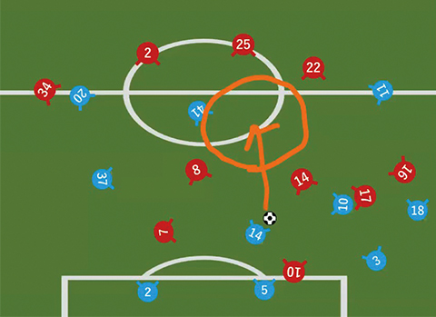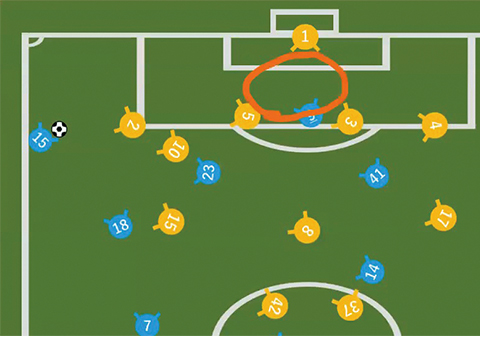 「ディフェンスラインとGK の間を動くことで得点につながりやすいので、僕はこのエリア(丸囲み部分)へ走り込みました」