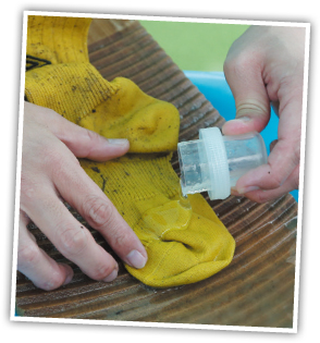 左ページの3~6の手順で洗った後、水で濡らしたあて布の上にユニフォームの表面を重ねます。ユニフォームの裏側から、歯ブラシのような毛の細かいもので、トントンとやさしくたたいてください。または、ウタマロ石けんで洗った後、40度のぬるま湯でつけ置きを。墨はとても粒子が細かいので繊維の奥まで入り込み、時間が経過すると完全に落としきるのは難しくなるのでなるべく早く洗うことが重要です。