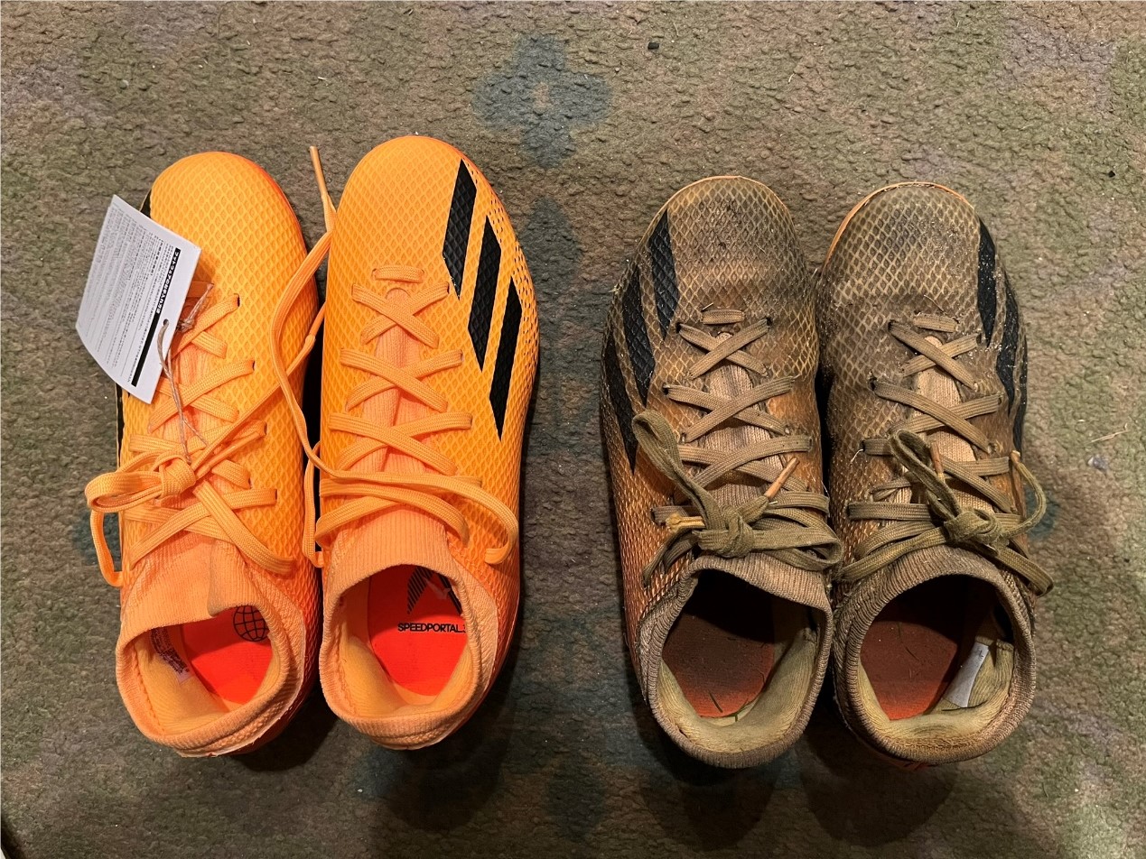 我が家も、特に次男はシューズのフィット感に敏感で、スパイクやトレシューのモデルを替えるとプレイに影響が出てしまうような気がして、ずーっと同じメーカーの同じモデルを購入し続けています。実際はちゃんと足に合うモデルであれば替えたって問題ないのでしょうけれど。調子を落とさず安心して試合に臨みたいという意味では、これも一種のゲン担ぎでしょうか。