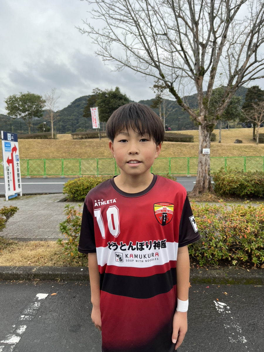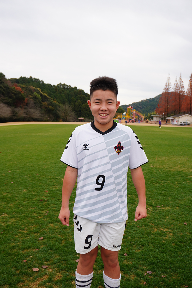 「チームとして勝ち切るということを目標にしてきたので、全国大会に出ることができてとても嬉しいです。ネイマール選手(ブラジル代表、アル・ヒラル所属)が憧れなのですが、同じ左サイドやトップ下として、ドリブルやシュートでのチャンスメイクでチームに貢献できるプレーが得意です。これまで家族みんなで試合の応援をしてくれていて、今回の大会にも来てくれました。家族の期待に応えられるように精一杯これからも努力して、夢であるプロサッカー選手になりたいです!」