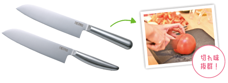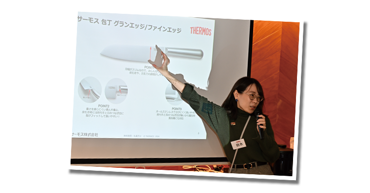 「新しく発売したオールステンレス包丁は、スリムな刃幅にすることで小回りがきき、洗いやすくなっています。さびにくさや握りやすさにもこだわり、食洗器にも対応。スタンダードな『ファインエッジ』と、切れ味がより長持ちする『グランエッジ』が揃っています」