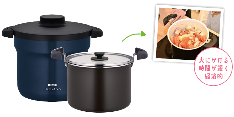 「調理鍋で調理をしたら、保温容器に入れるだけ。保温容器はステンレス魔法びん構造で熱を閉じ込めるので高温をキープできます。とろ火にかけたように余熱で火を通すため煮込み料理に最適。新たに発売したタイプは、調理鍋がセラミックコーティングになりました」