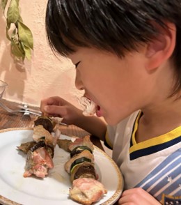 串焼き料理をイタリアでは「スピエディーノ」と呼び、イタリアでは鶏もも肉より豚レバーや羊、車海老などが串焼き料理としては主流です。これからの季節、外でバーベキューなどされる方にもぜひいろいろな組み合わせバリエーションを試して、楽しみながら美味しく親子でジュニアアスリートの増量にチャレンジいただけたらと思います。