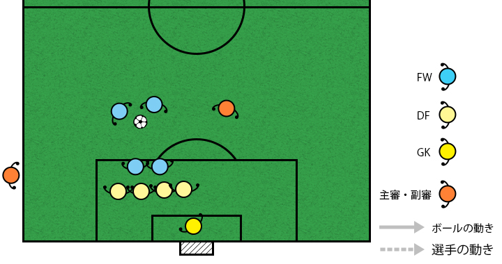 フリーキックは相手の邪魔を受けずに自由に蹴ることができる大きなチャンスであり、守備側も攻撃側のいろいろな状況を予測して工夫し合う面白い場面です。審判員はそれぞれの選手・チームの意図や状況を想定し備えています。そして、選手の安全と安心を保証し、反則された側が損をしないように公平にプレーが保たれるように気をつけています。